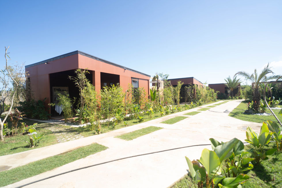 Experience the modern resort buildings surrounded by lush greenery and pathways. Enjoy the clear sky and tropical plants that create a serene atmosphere.